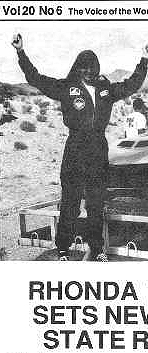 I give her a "thumbs up", and now it's time to really test overdrive! At 20 miles out,. she hits a few short sweeping turns, a short straight away, and now the road heads uphill. We are decreasing speed slightly because of the grade. Overdrive is working, but not to its full potential. Downshift to 4th, RPM jumps to 4,500. Over the hill and for the next 13 miles you've got a wide open straight away! One of the two fastest spots on the course. Rhonda lays into the throttle in 4th gear, hits 5,000 RPM and it's back into overdrive. At this point, we traveling 2.5 miles per minute at a speed of 150 MPH, RPM is almost 3,400. The safe speed on this road is rated at 55 MPH, but the surefooted 16" BF Goodrich Competition ZRs stick to the road like glue. 255-50s in back, 245-50s up front. Feel the tension, man, what a ride! Overdrive seems to work the best on the flats and down-hill straight aways. So far, 45 miles have been covered in 19 minutes. That's right,19 minutes. 50 miles out and the road surface changes drastically. Bumps, dips, rough pavement and fear jumps back in the front seat! Must decrease speed to about 125 or so through this area.